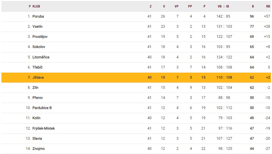 Výsledkově se ale Kolínským v poslední době příliš nedaří. Už bylo zmíněno, že v předešlých čtyřech zápasech nezískali ani bod a postupně podlehli Vsetínu, Slavii, Přerovu a Porubě. Předtím ovšem třikrát zvítězili nad Prostějovem, Třebíčí a Litoměřicemi. Proto jim aktuálně náleží jedenáctá příčka se 49 body na kontě.