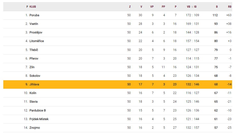 Jihlavským hokejistům se na závěr základní části nedaří. V posledních deseti zápasech totiž zapsali pouze dvě výhry a rázem tak mohli zapomenout na šesté místo s přímým postupem do play off, na které hned po reprezentační přestávce vyskočili. Závěrečná dvě kola určí, zda Jihlava začne předkolo play off venku a ve druhém a případném třetím utkání bude mít výhodu domácího prostředí, což by byla zřejmě nejlepší varianta. Druhá možnost je opačná – začátek předkola doma a druhé a případné třetí klání na ledě soupeře. Ve hře je ale i varianta poslední, nejméně úspěšná. Dukle s koncem základní části skončí i sezona.