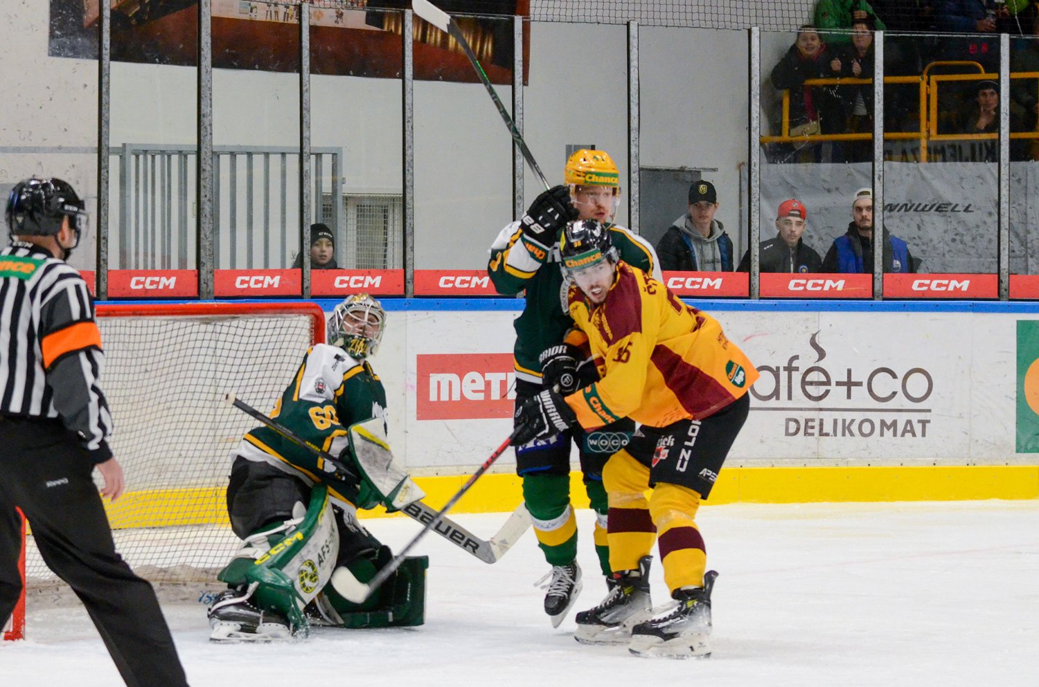 Sobotní duel Dukly a Vsetína se nesl ve vyrovnaném a bojovém duchu. O výhře Vsetína rozhodl až v posledních minutách zápasu Luboš Rob. Konečné skóre na zimním stadionu v Pelhřimově ukázalo skóre 3:4 pro domácí Duklu. Foto: Nela Dittrichová