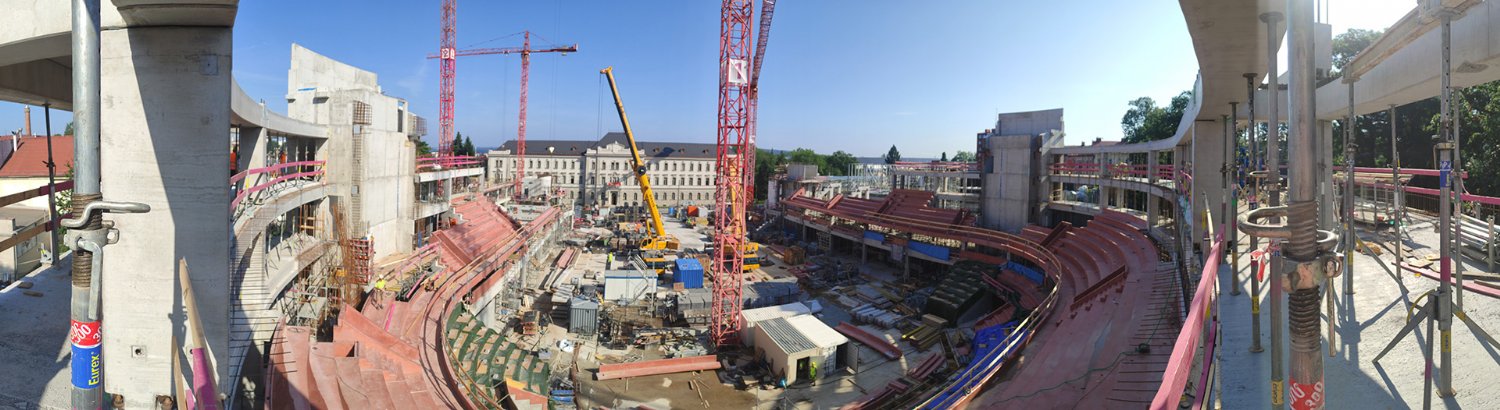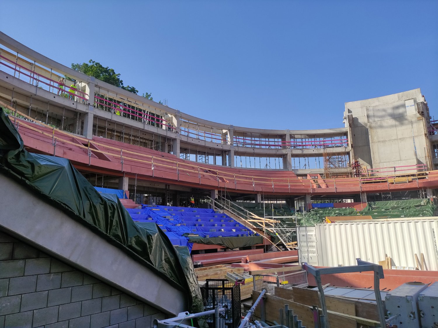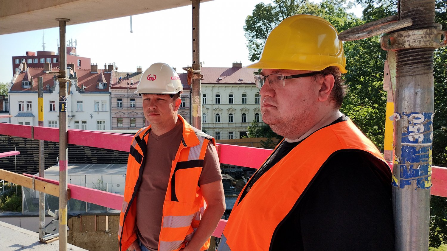 Teprve při prohlídce samotné stavby si dotyčný uvědomí, jak bude aréna skutečně obrovská. Z obrázků ani videí není její mohutnost až tak znát. Páté patro je opravdu vysoko a nabízí krásný výhled nejen na celé staveniště, ale i na jeho okolí. „Z pátého nadzemního podlaží se bude vstupovat do sky boxů, které budou zavěšeny na ocelové střeše. V současné době dokončujeme strop nad tímto podlažím. Čeká nás ještě patro a půl a budeme mít nachystáno na střechu,“ prozrazuje Petr Kráčmar a informuje, jak probíhá výstavba vedlejšího objektu, kde historicky stávala Pivnice Posilovna. „Aktuálně vážeme sloupy 3. nadzemního podlaží a připravujeme i obvodové stěny a hlavní nosné stěny, které jsou na vykonzolované části nad ulicí Jiráskova.“