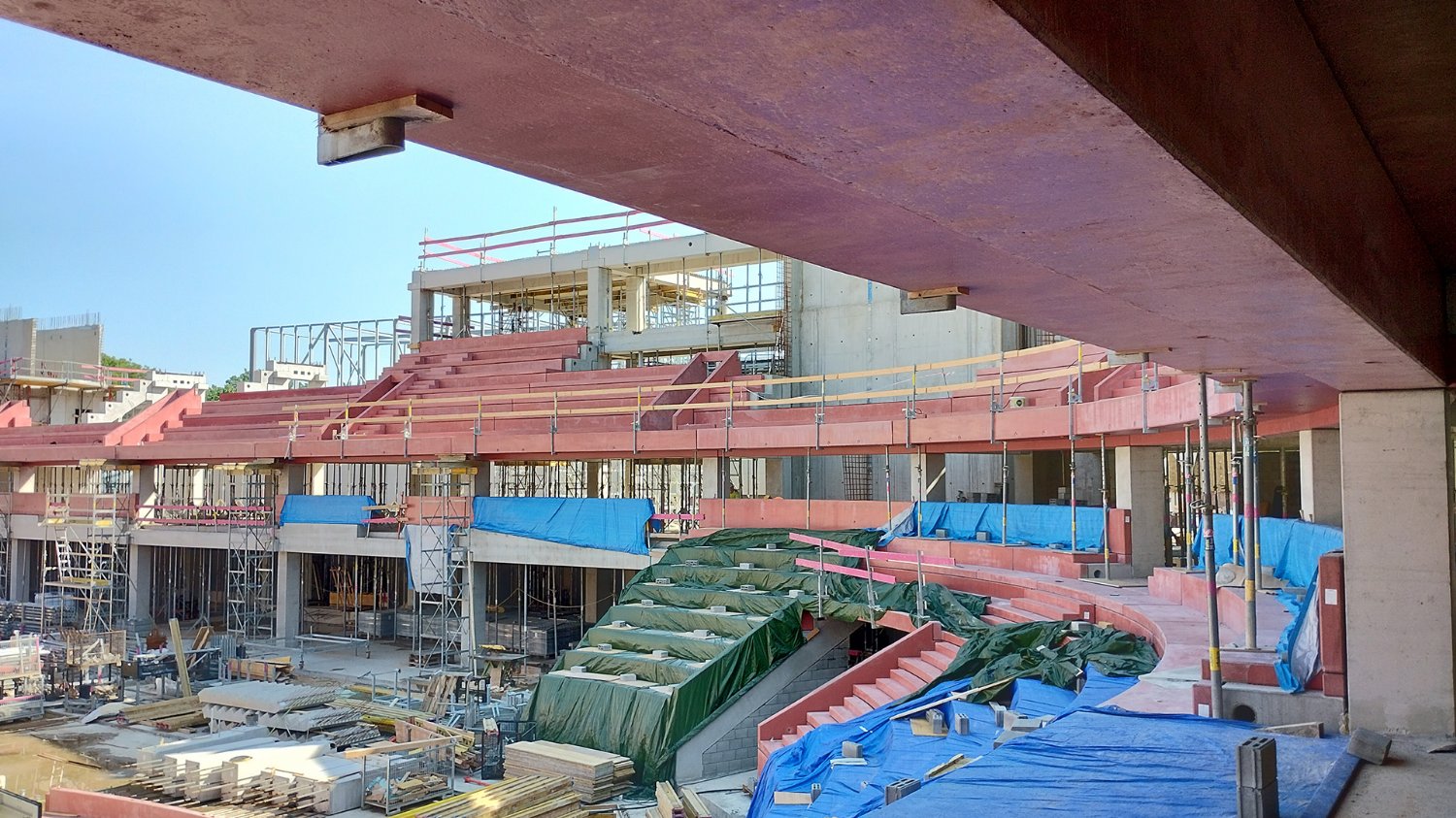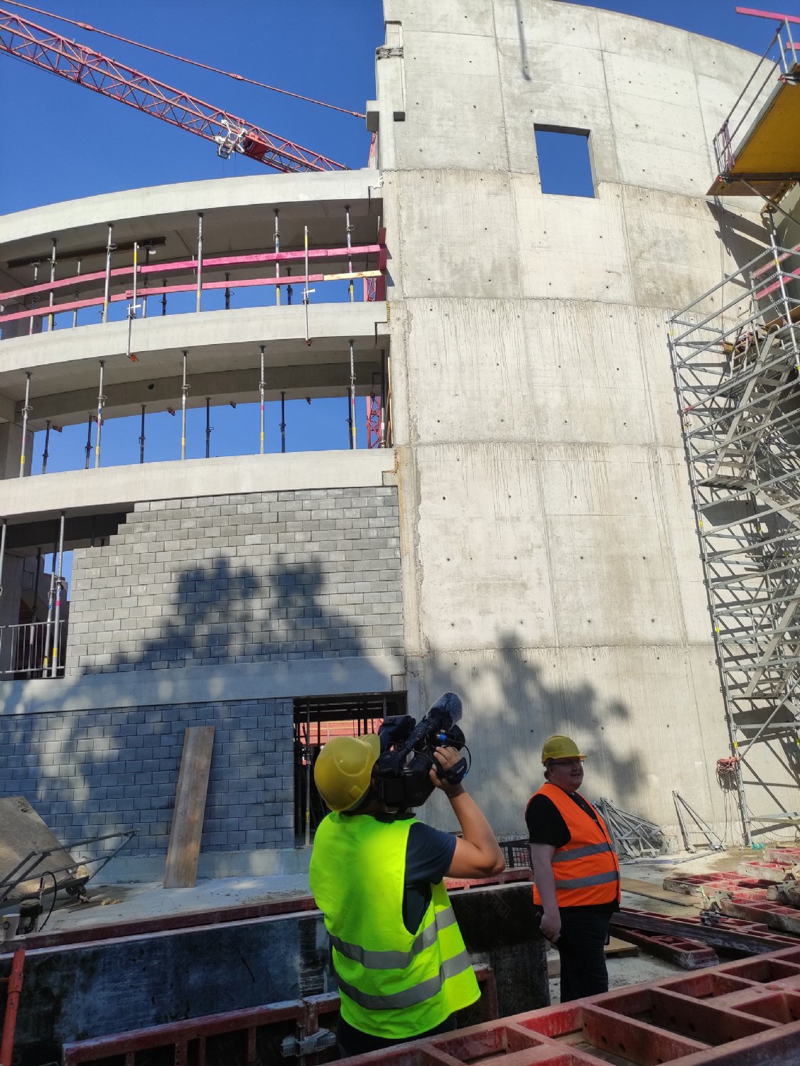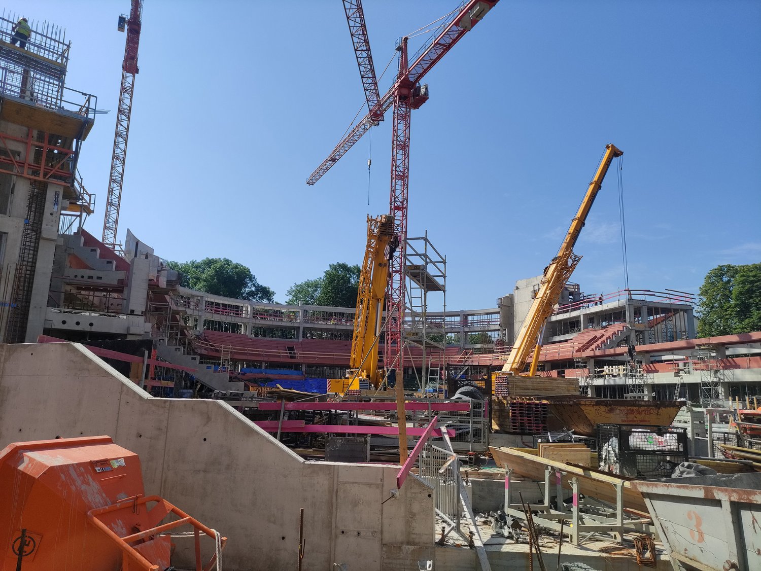 10. 7. 2024 na stavbu opět zavítal štáb HZStv1, aby přinesl fanouškům již 23. video z kompletní výstavby arény. Díky dlouholetému redaktorovi HZStv1 Dušanu Majerovi a manažerovi projektu Petru Kráčmarovi mohla na staveniště zavítat i redakce Dukly. „Během uplynulých tří týdnů jsme nasadili jeřáb a začali jsme pracovat na montáži čtvrté sekce, kde máme namontovaná dvě patra. Na vjezdu do garáží jsme provedli betonáž základových pasů pod opěrné stěny a připravujeme podloží pro základovou desku,“ sděluje pro HZStv1 Petr Kráčmar a prozrazuje, jak to vypadá s výstavbou čtyř jáder. „Jádro 1 a 2 máme dokončené po střechu. V současné době pracujeme na jádrech 3 a 4, kde jsme na úrovni čtvrtého, resp. třetího nadzemního podlaží. Tato jádra dokončíme do konce srpna,“ hlásí.