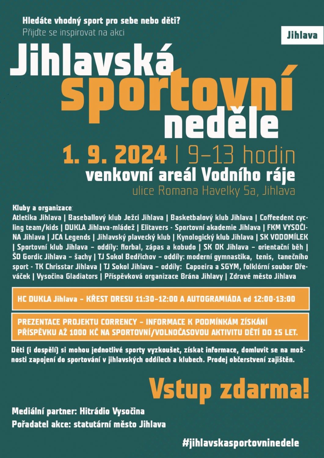 Na Jihlavské sportovní neděli si můžete vyzkoušet přes dvacet různých sportů napříč mládežnickými organizacemi v Jihlavě. Svůj stánek budou mít tradiční sporty jako jsou hokej, fotbal nebo atletika, představí se ale i méně rozšířené sporty, například orientační běh nebo v posledních letech v Jihlavě velmi úspěšný americký fotbal. Kompletní přehled všech zapojených organizací naleznete na plakátu na konci tohoto článku.