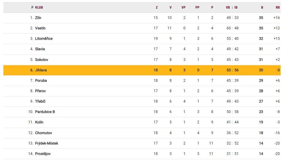 Ačkoliv jihlavští hokejisté v posledním kole padli v Chomutově 1:4, zažívají nejlepší období v sezoně. Během posledních deseti zápasů totiž dokázali vyhrát hned osmkrát. V tabulce se tak posunuli na šesté místo a po relativně nedobrém začátku ztrácí na první Zlín jen pět bodů, navíc od druhých Litoměřic je dělí body dva. Celkem Dukla posbírala 30 bodů a na svého nejbližšího soupeře, osmý Přerov, jenž vyhrál nyní třikrát v řadě, má dvoubodový náskok. Tabulka je poměrně vyrovnaná, třetí Litoměřice s 32 body dělí od deváté Třebíče jen šest bodů.