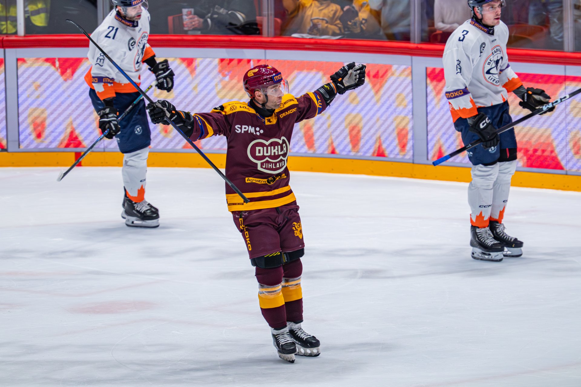 Během domácích zápasů s Litoměřicemi a Sokolovem sice Dukla ani jednou neprohrála za 0 bodů, zároveň zvítězila jen jednou, když Litoměřice 10. prosince 2025 smetla výsledkem 6:2. Tři asistence tehdy zaznamenal Tomáš Čachotský, nejlepší nahrávač Maxa ligy. Foto: Martin Domanský