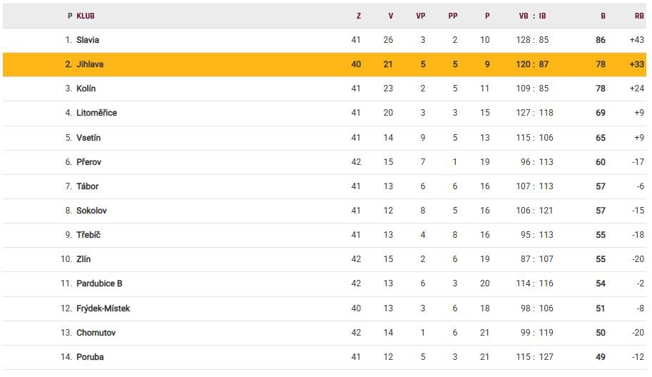 V Maxa lize se schyluje k opravdu dramatickému finiši. Poruba za poslední čtyři kola nasbírala 7 bodů a byť je v tabulce na posledním místě, už ztrácí jen bod na třináctý Chomutov a dva body na dvanáctý Frýdek-Místek. Ba co víc. Čtrnáctou Porubu dělí od deváté Třebíče pouze šest bodů a od sedmého Tábora jen osm bodů. Při tříbodovém systému mohou některé týmy během pár kol bojovat o holou záchranu Maxa ligy místo o play off a naopak. V podobné roli je i nedělní jihlavský soupeř Sokolov. Baník je sice na relativně pohodlné osmé pozici se ziskem 57 bodů a jen 3 body ho dělí od šestého Přerova a přímého postupu do čtvrtfinále, ale na druhou stranu na poslední Porubu má k dobru „jen“ osm bodů. Podobné starosti nemusí mít sobotní soupeři Litoměřice a Jihlava. Stadion hájí čtvrté místo před dotírajícím Vsetínem, Dukla se pere s Kolínem o druhou pozici.