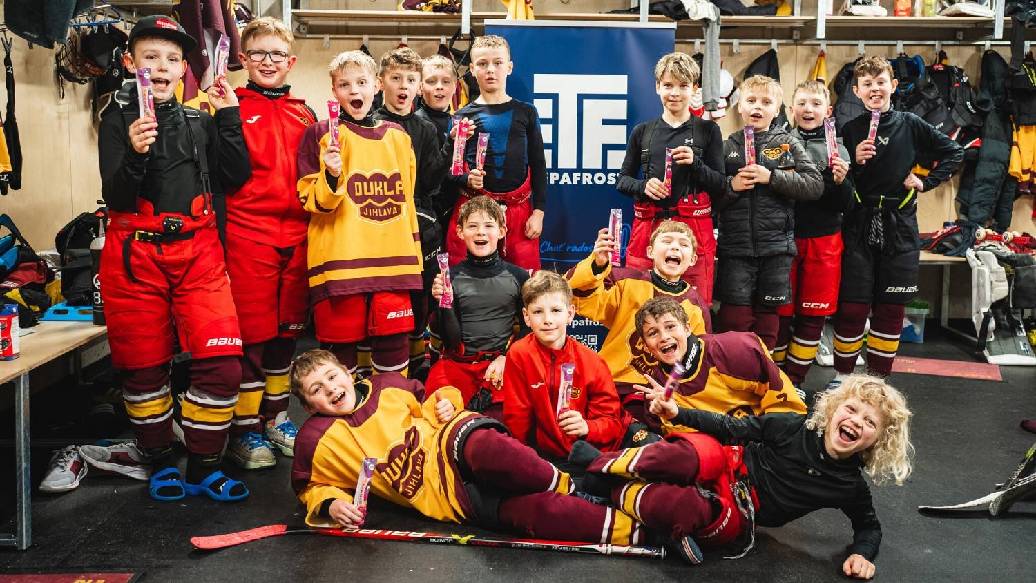 Sestava Dukly Jihlava žlutý tým: Venzara - Tůma, Hurda, Obůrka, Crhán - Cmunt, Krejčí, Peřina, Zeman, Tlustý, Kolda, Karas.