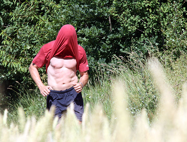 Před objektivem fotoaparátu, který na něj mířil z pšeničného pole, schoval hlavu pod tričko Aleš Padělek.