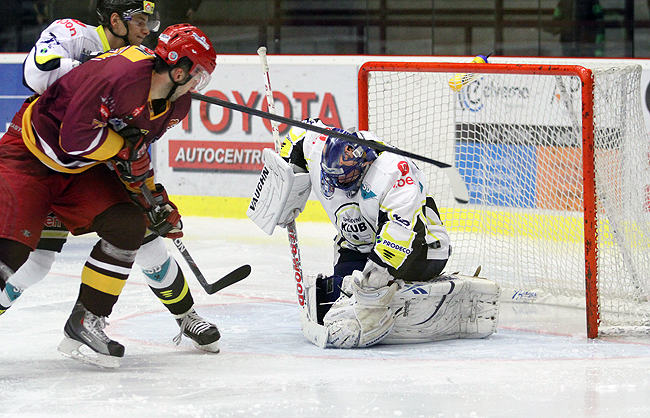 Kadaňská branka zůstala nepokořena až do 55. minuty, kdy skóroval v přesilovce pět na tři obránce Tomáš Kolafa. Víc gólové radosti ale Dukla v utkání 16. kola první ligy nepoznala. Foto: Zbyněk Zápotočný