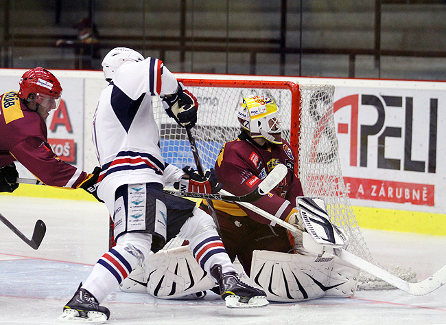 Letos se v prvním vzájmeném zápase radovala z vítězství 3:2 na domácím ledě jihlavská Dukla. Gólman Filip Novotný se představil před domácím publikem poprvé v soutěžním zápase. Foto: Zbyněk Zápotočný