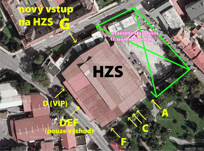 Plánek ukazuje, kterými vchody se dostanete na Horácký zimní stadion.