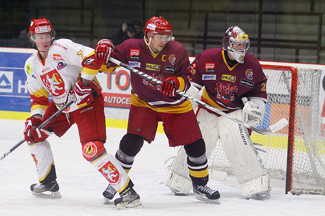 Kapitán Dukly Jihlava Tomáš Ficenc čistí prostor před brankou Dominika Halmošiho v zápase s Hradcem Králové, za který krátce nastupoval útočník Ladislav Rytnauer (vlevo) Foto: Zbyněk Zápotočný