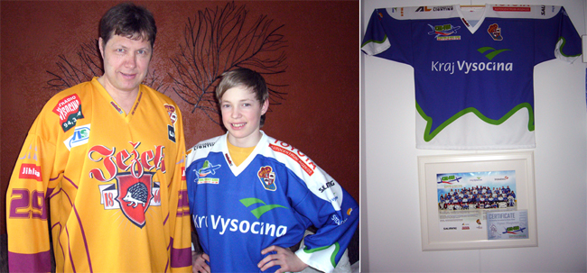 VZPOMÍNKY NA LOŇSKOU ŠKOLU. Účastník loňské Mezinárodní hokejové školy Topias Haapanen se vyfotil doma ve Finsku v dresu IIHS spolu se svým otcem, který si z Vysočiny na sever Evropy odvezl dres Dukly Jihlava. Ve svém pokoji má Topias modrý "vysočinský" dres vystavený spolu s plakátem a certifikátem o absolvování hokejové školy v Jihlavě. Foto: Archiv Topiase Haapanena