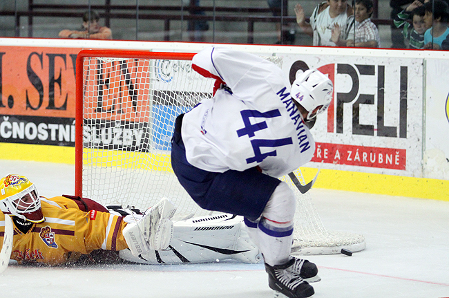 MÍŘÍ DO SPARTY. Obránce Antonin Manavian hájil v sezoně dres francouzského Rouenu. Nyní je na zkoužce v pražské Spartě, proto na přípravný zápas do Jihlavy nedorazí. Takhle si loni počínal před gólmanem Dukly Filipem Novotným. Foto: Zbyněk Zápotočný