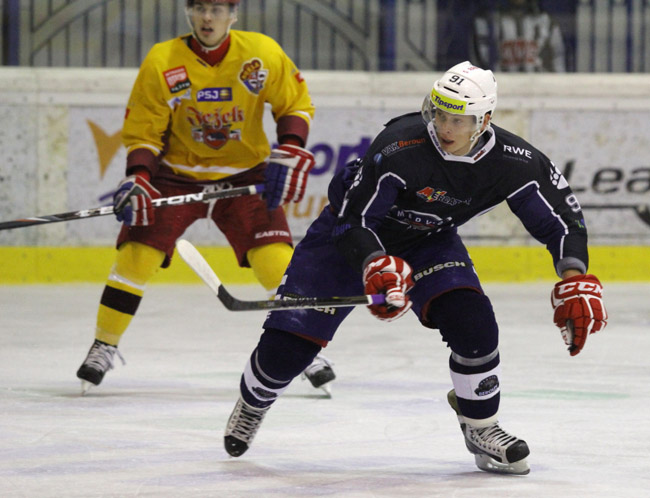 Pavel Klhůfek ze Slavie Praha nyní nastupuje za berounský tým. V pozadí jihlavský obránce Vojtěch Zadražil. Foto: www.medvediberoun.cz