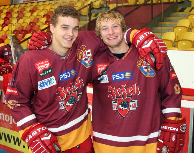 KAMARÁDI PROTI SOBĚ. Takhle spolu pózovali Prokš s Jíchou před focením na plakát A-týmu. Teď se střetávají jak na ledě v dresu juniorky tak na ledech druhé ligy jako soupeři. Foto: Zdeněk Drla