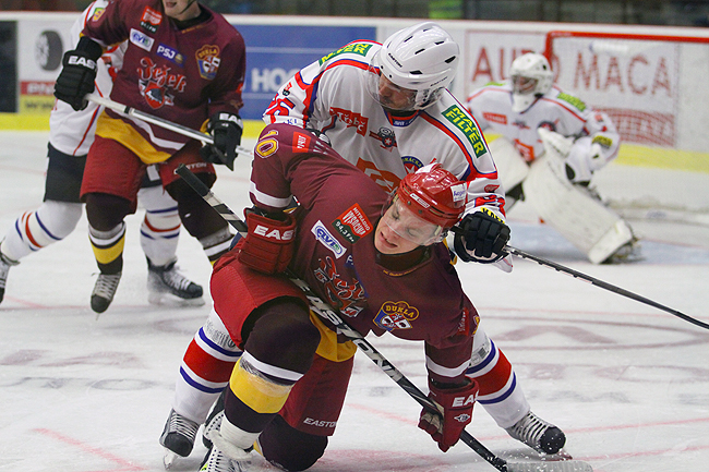 BOJ O KAŽDÝ CENTIMETR LEDU. Tvrdě atakovaný Radek Hubáček bojuje v útočném pásmu. Skončí tentokráte na kolenou třebíčští hokejisté? Foto: Zbyněk Zápotočný