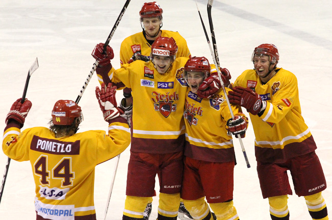 NEJMLADŠÍ LAJNA? Čtvrtá lajna Dukly Jihlava se raduje ze vstřeleného gólu v pondělním utkání v Písku. Adam Pometlo (22 let) přijíždí slavit s Markem Prokšem (20), Jakubem Pekárkem (20) a Martinem Jíchou (20). V pozadí v tu chvíli nejstarší Duklák na ledě - Marek Drtina (23). Foto: Zdeněk Drla