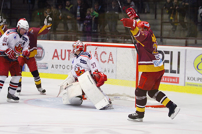 RADOST Z GÓLU. Martin Filip se raduje z vyrovnávací branky Daniela Hodka. Kolikrát zvednou jihlavští hokejisté ruce nad hlavu v sobotním duelu?