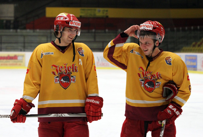 BUDE VESELO I PO NADSTAVBĚ? Útočníci jihlavské juniorky Martin Gregar (vlevo) a Roman Mikeš odjíždějí spokojeně z ledu poté, co Dukla porazila po nájezdech pražskou Slavii 2:1. Budou mít důvod k úsměvu i po odehrání deseti kol nadstavby? Vybojují čtyřku zaručující play-off? Foto: Josef Plechatý
