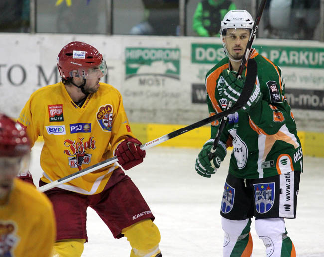 OSTRAŽITOST. Matic Podlipnik si bedlivě střeží mosteckého protihráče v utkání, jenž Dukla ovládla a zvítězila pohodlně 7:3. Podaří se jí zopakovat výborný výkon? Foto: Zdeněk Drla