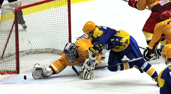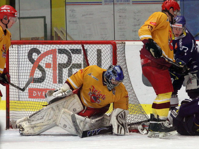 OPORA JUNIORKY. Gólman Tomáš Fučík si v sobotu v Litoměřicích odbyl svoji premiéru mezi dospělými. Během sezony je oporou jihlavské juniorky. Na snímku likviduje jednu ze šancí v zápase NOEN extraligy proti Vítkovicím...