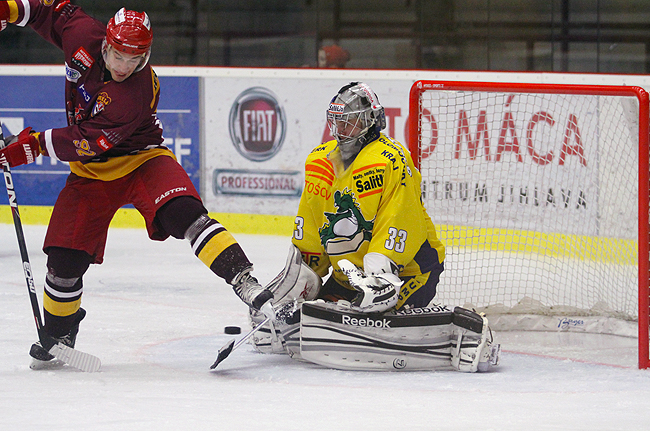 JAK NA DRAKY? Při minulém duelu mezi Duklou a Šumperkem (ve 24. kole ve středu 21. listopadu 2012) hájil dračí svatyni exjihlavský Vratislav Vajner. Takhle se jej snažil překonat Michal Jeslínek. Najdou jihlavští střelci recept na šumperské gólmany i ve středu? Foto: Zbyněk Zápotočný