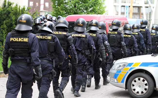 POLICEJNÍ ZÁSAH. Nácviku zásahu na Horáckém zimním stadionu se zúčastnilo sedmdesát policistů z krajské pořádkové jednotky. Foto: Zdeněk Drla