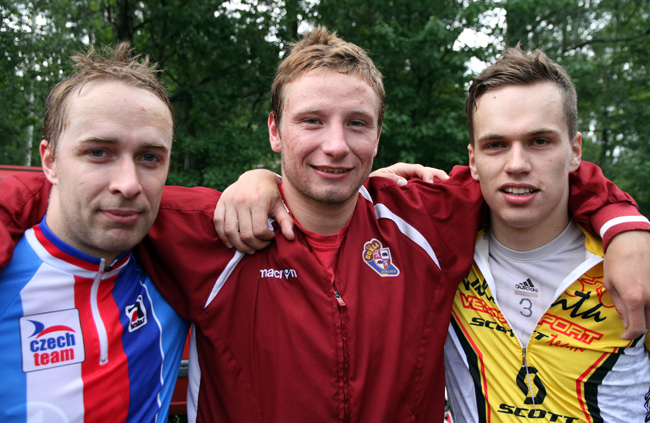 MEDAILE. Stupně vítězů v letošním Železném muži vybojovali Martin Jícha (uprostřed), Tomáš Čachotský (vlevo) a Vojtěch Zadražil (vpravo). Foto: Zdeněk Drla