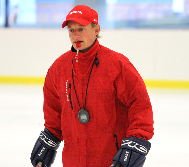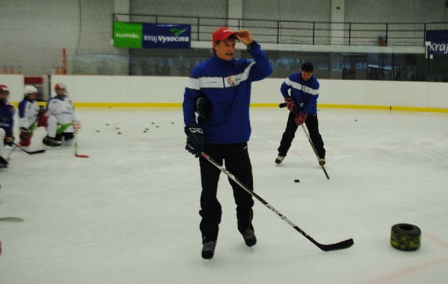 Jako trenér Mezinárodní česko-finské hokejové školy 2013 (v popředí). Na snímku je zachycen při měření rychlosti střelby, kdy puk z jeho hole dosáhl rychlosti 115 km/h. Foto: Tomáš Lysý.
