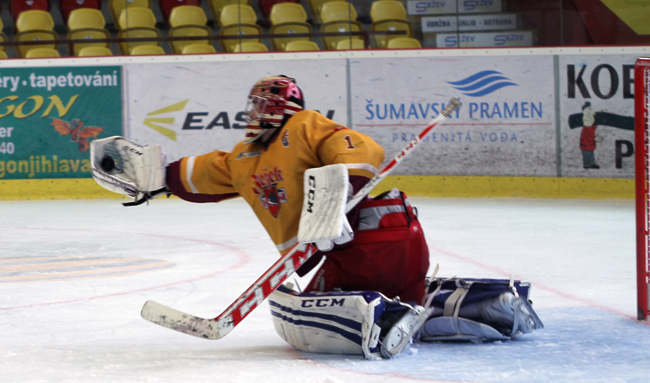 STRŮJCE SOBOTNÍ VÝHRY. V zápase proti Chomutovu si připsal Tomáš Fučík (na snímku) dvaačtyřicet úspěšných zákroků a přispěl tak k výhře svého týmu. Fotografie je z utkání šestého kola extraligy juniorů proti Třinci, kdy mladý gólman vymazal střelce Ocelářů a nepustil za svá záda ani jednu z pětatřiceti střel. Foto: Josef Plechatý.