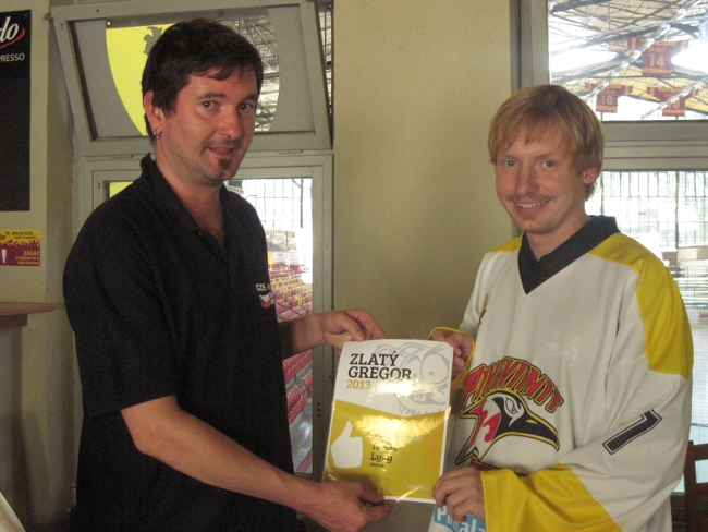 DODATEČNÉ PŘEDÁNÍ CENY. Po slavnostním ukončení Mezinárodní česko-finské hokejové školy dostal redaktor webu hcdukla.cz Tomáš Lysý (vpravo) cenu za "Přínos pro firmu Esports.cz". Protože se předání na redakčním srazu nemohl zúčastnit, dostal ocenění dodatečně od šéfredaktora webu Dukly Zdeňka Drly.