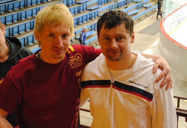 S KAPITÁNEM. Tomáš Lysý (vlevo) při autogramiádě před zápasem, ve kterém se dlouholetý kapitán Dukly Jihlava Oldřich Bakus (vpravo) loučil se svojí kariérou. Foto: archiv Tomáše Lysého