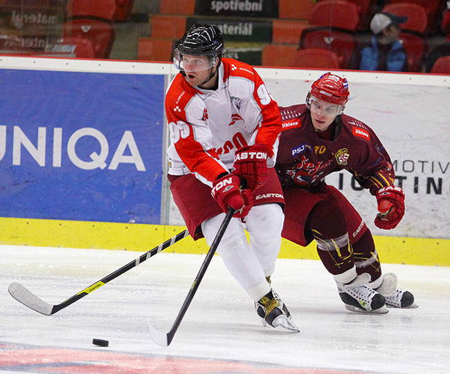 SOUBOJ S KOHOUTY. Jihlavská Dukla vyhrála první letošní vzájemný duel 5:4 po prodloužení, když se o všech pět gólů podělili dva útočníci: Adam Zeman a Filip Seman. Pro Zemana to byl první hattrick v sezoně. Na snímku stíhá jihlavský Radek Hubáček olomouckého Matěje Pekra. Foto: Zbyněk Zápotočný