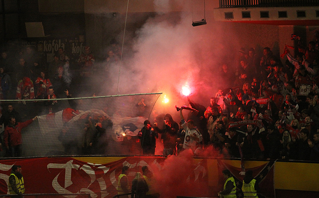 ZAČÁTEK VÝTRŽNOSTÍ. Nájezdy skončily, Třebíč vítězí. Ze sektoru hostů létají první dělobuchy a dýmovnice. Foto: Zbyněk Zápotočný