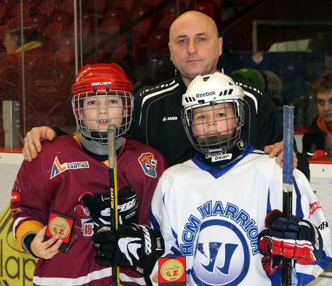 PRVNÍ ZÁPAS. V prvním utkání turnaje prohráli mladí Dukláci s brněnským Warriorem 3:5. Ceny nejlepším hráčům, kterými byli vyhlášeni Matouš Menšík (Dukla Jihlava) a Jakub Kos (Warrior Brno), předal trenér A-týmu Dukly Jihlava Petr Vlk. Foto: Josef Plechatý