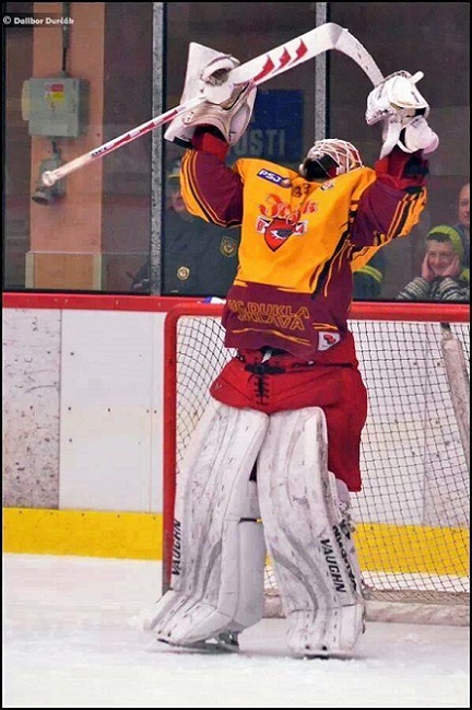 JE TO TAM. Gesto Davida Ritticha je jasné – před pár vteřinami Dukla vyhrála i čtvrtý zápas čtvrtfinále s Havířovem a stala se prvním týmem postupujícím do semifinále. Mladý gólman k postupu pomohl výraznou měrou. Střelci Havířova z něj kolikrát byli doslova zoufalí. Během čtyř zápasů vyslali na jihlavskou klec celkem 139 střel, pouze šest si však našlo cestu za záda Davida Ritticha. Průměr 1,5 gólů na zápas a 95,68% úspěšnost zásahů gólmana červenožlutých hovoří za vše. Foto: Dalibor Durčák.