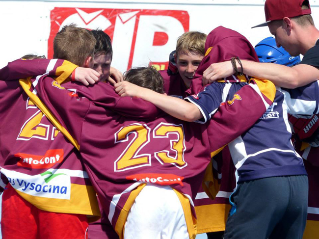 RADOST VE FINÁLE. Malí hokejisté Dukly Jihlava triumfovali na finálovém furnaji akce Hokejbal proti drogám v Praze. Nejlepším střelcem turnaje se stal Tomáš Chlubna (dolní foto). Foto: Tomáš Dzurik
