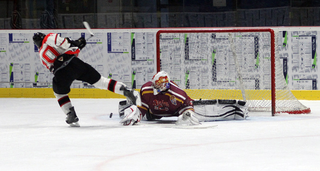 VYCHYTANÉ NÁJEZDY. Lukáš Sáblík likviduje pokus znojmského Martina Podešvy. V samostatných nájezdech byl stoprocentní, nekapituloval ani jednou. Foto: Lukáš Caha (www.hcorli.cz)