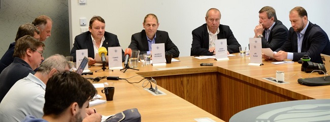 TISKOVÁ KONFERENCE. V novém sídle Českého svazu ledního hokeje v Harfa Office Parku v těsném sousedství O2 Areny představili novinářům Zlaté utkání (zleva) šéftrenér ČSLH Slavomír Lener, jednatel Dukly Jihlava Bedřich Ščerban, trenér týmů mistrů světa 1999-2001 Josef Augusta, trenér Vladimír Martinec, jenž byl u všech čtyř zlatých triumfů na přelomu milénia, a obránce Jiří Šlégr, který se utkání v Jihlavě, kde se narodil, zúčastní jako hráč. Foto: ČSLH/Karel Švec
