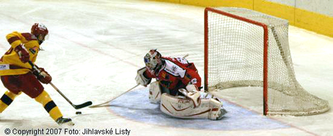 PŘED LETY. Současný kapitán Dukly Jihlava se pokouší překonat tehdejšího gólmana Prostějova Lukáše Danečka. Psal se 10. říjen 2007. Dukla tehdy podlehla Hanákům 2:5. Oba dva jihlavské góly vstřelil Karel Nekvasil, nyní trenér mládežnických týmů Dukly Jihlava. Foto: Jihlavské listy