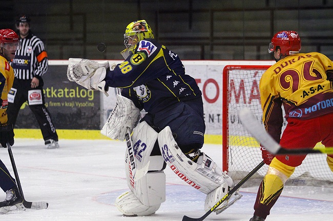 GÓLOVÁ SMRŠŤ. Ve 30. kole loňského ročníku první ligy se Dukla na domácím ledě pořádně rozstřílela. Ústí odjíždělo s devítigólovým přídělem. Tento pokus Michala Důrase ještě Michael Petrásek zlikvidoval, na další střelu šikovného útočníka už nestačil. Foto: Zbyněk Zápotočný