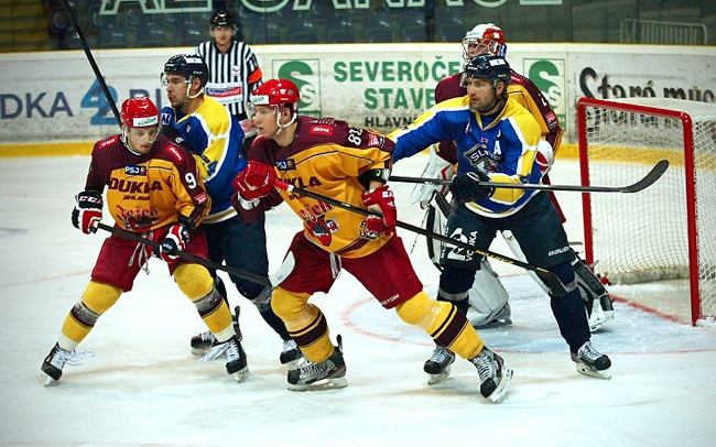 DOMA S ÚSTÍM. V minulé sezoně platilo ve vzájemných zápasech Dukly s Ústím rčení ´Můj dům, můj hrad´. Dukla brala doma tři body za výhry 3:2 a 9:3, ze severu Čech naopak nedovezla ani bod. Stejné je to zatím i letos. Ve 12. kole prohrála Jihlava se Slovanem 3:4. Foto: Karel Dvořáček (www.sportyusti.cz)