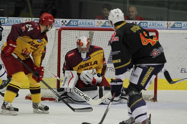 Zcela opačně probíhala odveta v 16. kole na Horáckém zimním stadionu. Souboj odstartovali lépe domácí, kteří skórovali hned po dvaceti vteřinách hry, prosadil se Adam Zeman. Ještě v prvním dějství hosté vyrovnali. Ve druhé části se pak dokonce ujali vedení. Strhující třetí část přinesla tři góly, Dukla hned dvakrát vyrovnala, trefili se Marek Melenovský a Jakub Matai. Zápas dospěl až do prodloužení, které o vítězi nerozhodlo. Samostatné nájezdy pak přisoudily bonusový bod zásluhou dvou tref Tomáše Čachotského Dukle, která tak zvítězila 4:3.