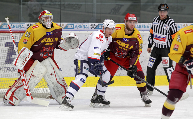 Poslední odehrané kolo potvrdilo, že v letošním ročníku první ligy může porazit každý každého - bez ohledu na papírové předpoklady či postavení v tabulce. Jihlavská Dukla si v sobotu poradila na svém ledě s favorizovanými Litoměřicemi. Všechny tři třetiny měly stejný vývoj. V té první vstřelila Dukla dva góly, ve druhé "provedli" to samé hráči s obřím kalichem na prsou, no a v té třetí se opakovala situace z prvního dějství. Všech šest gólů tak padlo do jedné branky. Dukla zvítězila 4:2.