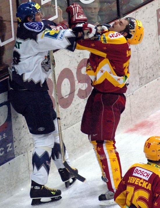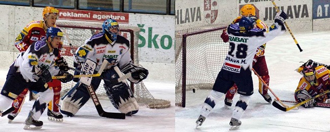 SPRAVEDLIVÁ DĚLBA BODŮ. Zatím posledním extraligovým zápasem mezi Duklou a Kladnem byl duel z 20.1.2005. Jihlava tehdy sahala na svém stadionu po výhře, ještě čtyři minuty před koncem vedla 4:3 (na snímku vlevo stínuje Michal Jeslínek před Zdeňkem Orctem), ale v šestapadesáté minutě už Kladno vyrovnalo. Radost z gólu Martina Frolíka měl i Miloslav Hořava (snímek vpravo), který hraje za Rytíře i v této sezoně, je jejich nejlepším střelcem, a s dosavadními 26 góly bude jednou z hlavních zbraní Rytířů. Foto: Petr Novák.
