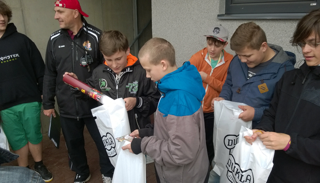 DÁRKY. Osmáci ze Základní školy Křížová dostali na tréninku drobné dárky a upomínkové předměty od Dukly Jihlava. Foto: Zdeněk Drla