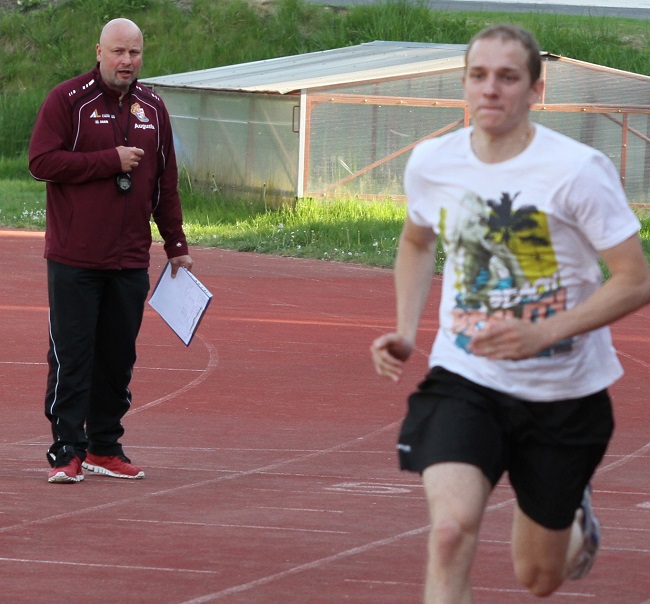 NA DRÁZE. Do programu letní přípravy juniorského týmu je zařazena celá řada aktivit. Trenér Patrik Augusta (vlevo) sleduje útočníka Jiřího Bambulu při tréninku na atletickém oválu v areálu Na Stoupách. Foto: Zdeněk Drla