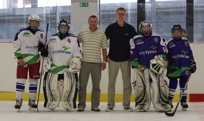 Toisen pelin parhaat pelaajat. Dominik Vacík ja Jasperi Jokinen joukkueesta White Kings (1. Ja 2. vasemmalta) ja Filip Krejčí ja Nikke Paunila (5. Ja 6. vasemmalta). Palkinnot jakoi Vítězslav Holub (Tsekin liikuntaliiton johtaja) Ja urheilukoulun suomalainen johtaja Hannu Tyry (3.ja 4. vasemmalta). Foto: Tomáš Lysý.