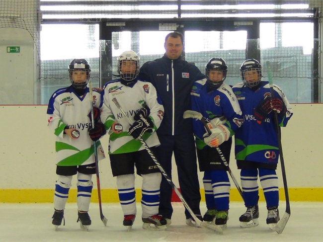 NEJLEPŠÍ HRÁČI ZÁPASU. Z týmu White Kings si pro ocenění přišli Olli Lehtinen a Lukáš Dvořák. Puk pro nejlepší hráče Blue Sharks získali Jakub Egart a Samuli Tallgren (zleva). Ceny pro nejlepší hráče zápasu předával Jaroslav Špaček, bývalý vynikající obránce českého národního týmu, se kterým získal na olympijských hrách v roce 1998 v Naganu zlatou medaili a ve sbírce má také dva tituly mistra světa z let 2001 a 2005. Foto: Tomáš Lysý.