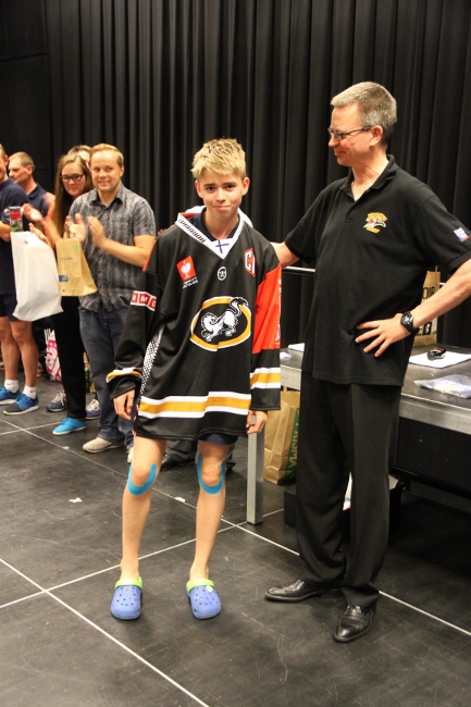 VÍTĚZ KANADSKÉHO BODOVÁNÍ. Hannu Tyry, manažer finské strany IIHS, předává Tomáši Chlubnovi cenu pro vítěze kanadského bodování hokejového kempu. Syn slavného otce dostal dres posledního mistra finské ligy, Kärpätu Oulu (verze pro Champions Hockey League), podepsaný Viktorem Ujčíkem. Foto: Tomáš Lysý.